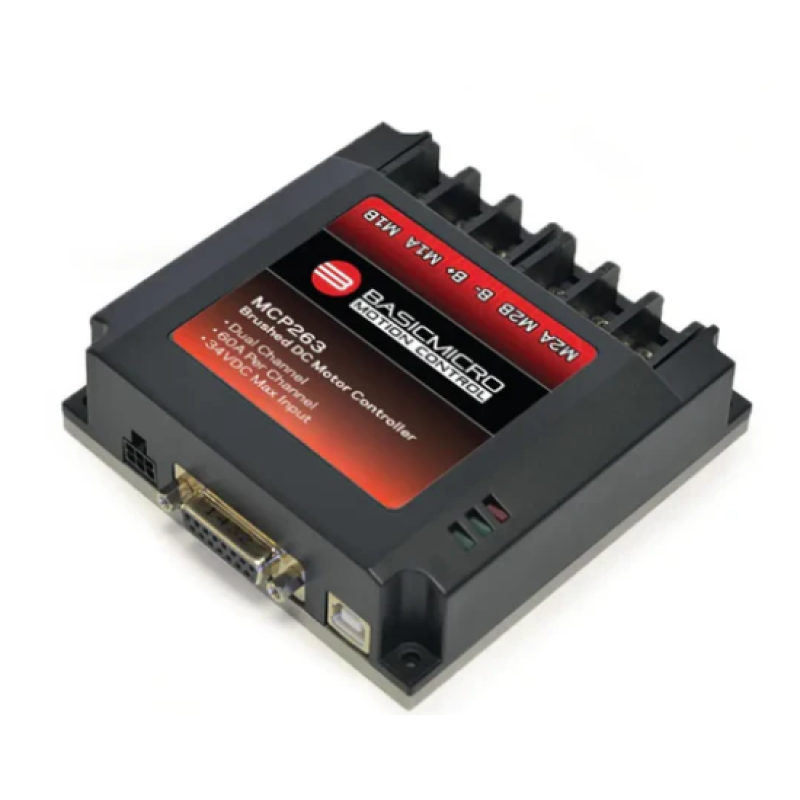 The MCP series of motor controllers are feature packed and customizable. They incorporate an advanced motion control scripting language. The MCP's scripting language is based on an easy to use variant of BASIC. The scripting language gives complete control over the motor controller's functions including changes to I/O and system settings on the fly. The scripting language supports 32 bit integer and floating point math, 32 bit variables, arrays, conditional statements and more. The MCP's I/O is scriptable, making it extremely adaptable to any application. Scripts are created and debugged from within the free Motion Studio application. The MCP's high degree of customization allows it to easily run as a stand alone controller or integrate into any system.